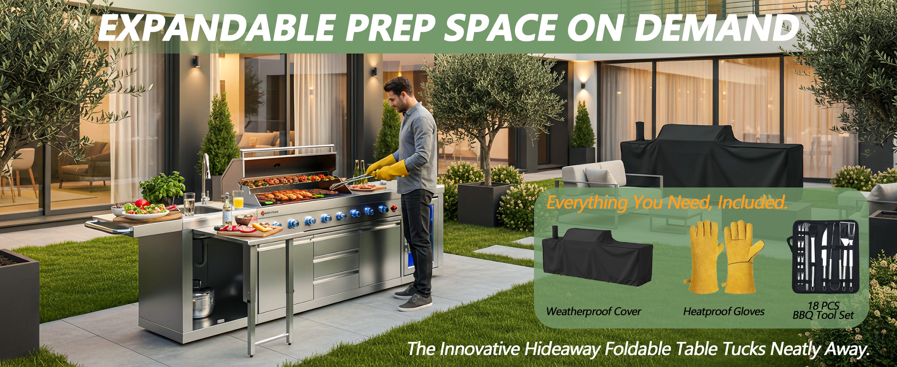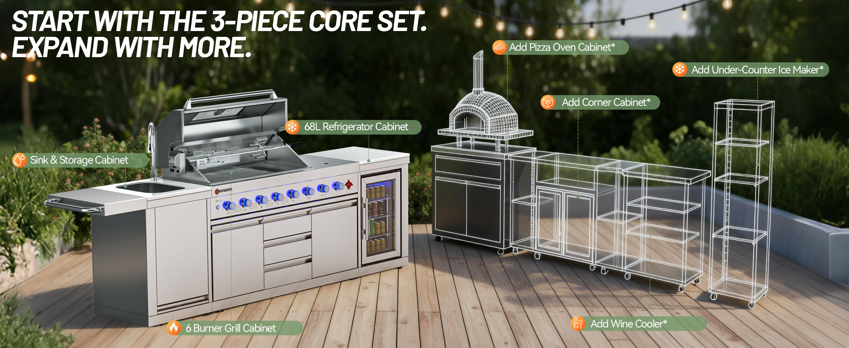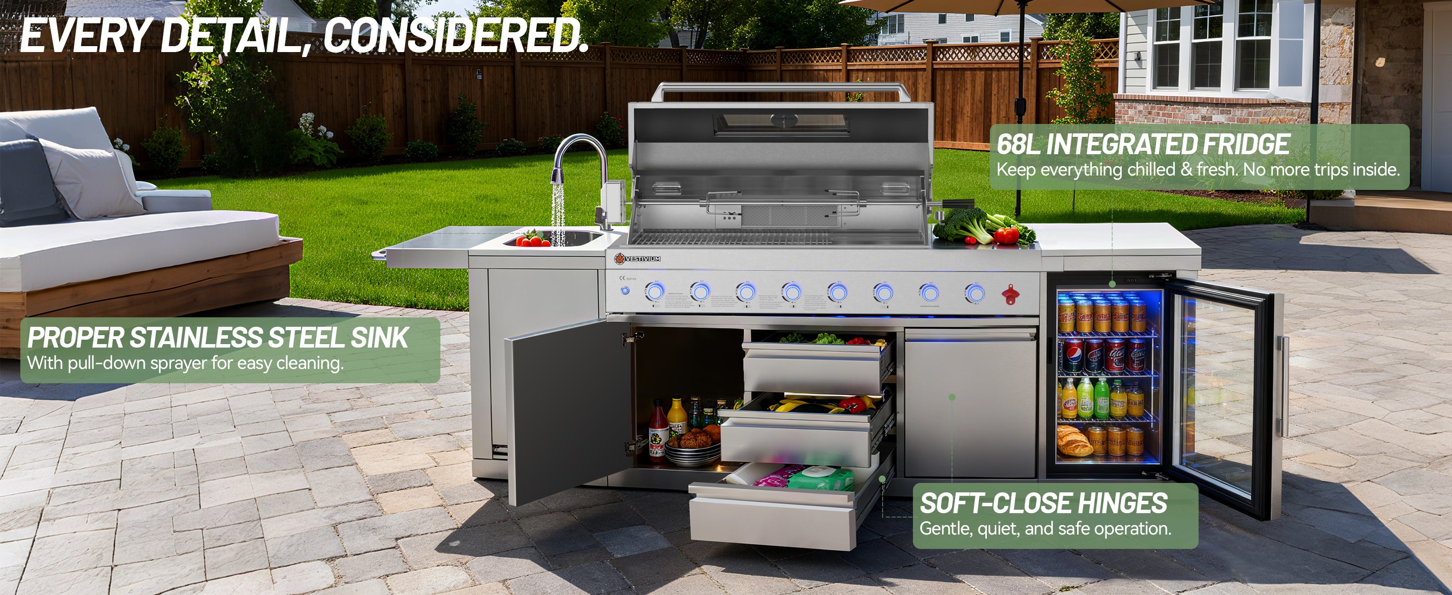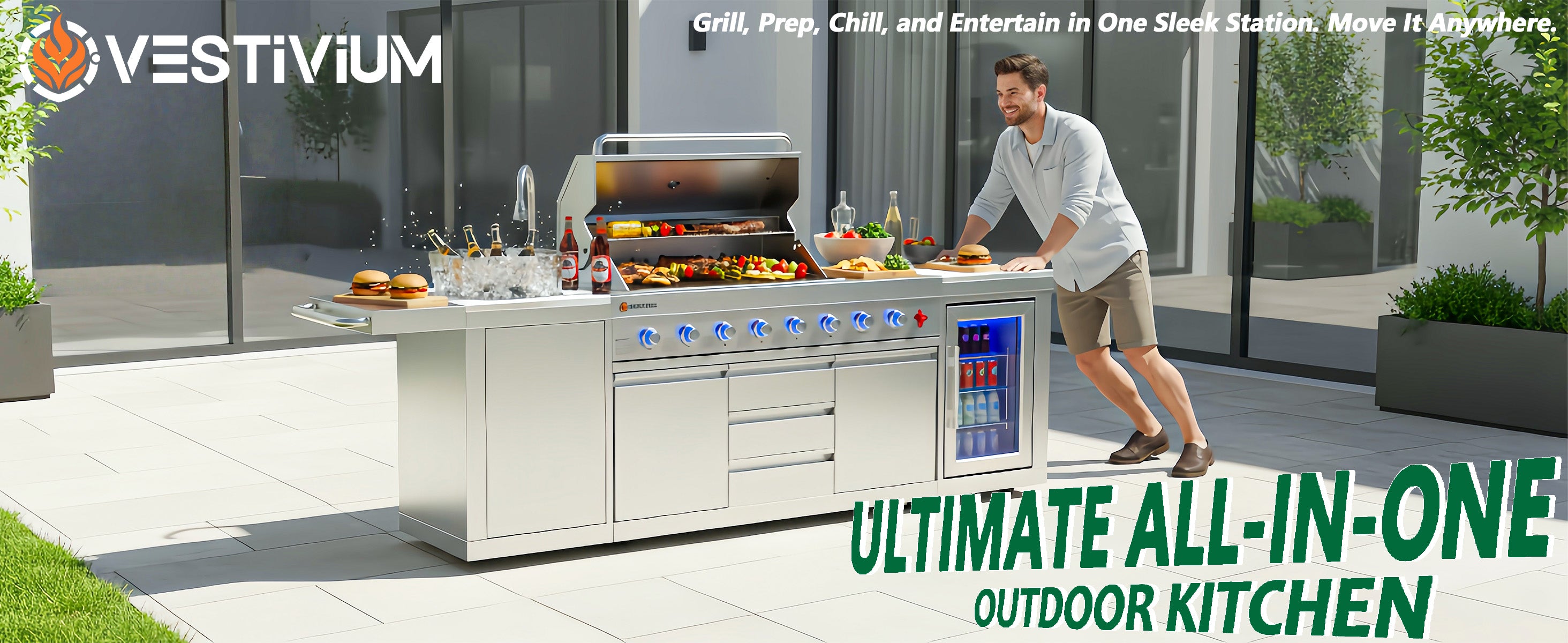 Elevate your backyard BBQ with the Vestivium Essential Outdoor Kitchen. This straight-line modular system features a powerful 6-burner gas grill for extensive cooking, an infrared rear burner for perfect rotisserie, and a convenient side burner for sauces and sides. Complete with an integrated sink cabinet for easy prep and cleanup, and a 68L single-door refrigerator to keep essentials chilled. Durable stainless steel construction ensures lasting outdoor enjoyment. The ideal compact solution for grilling and entertaining.