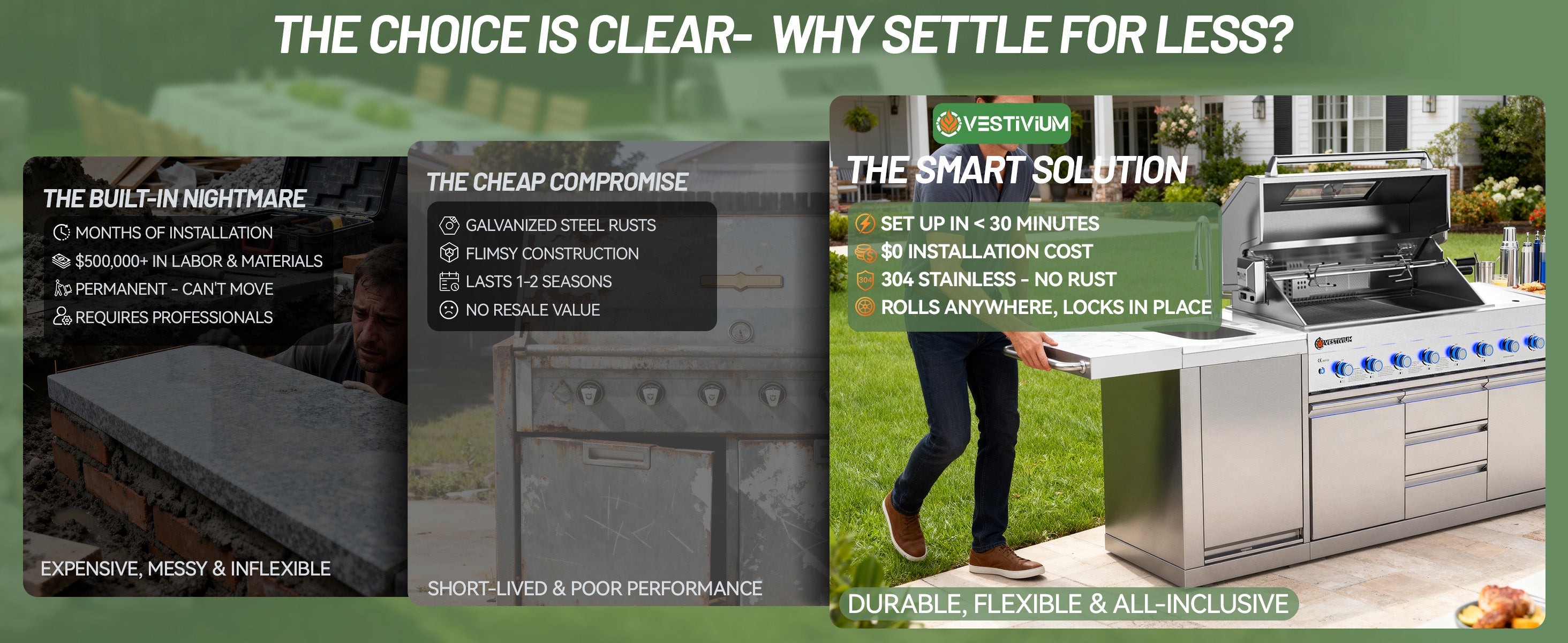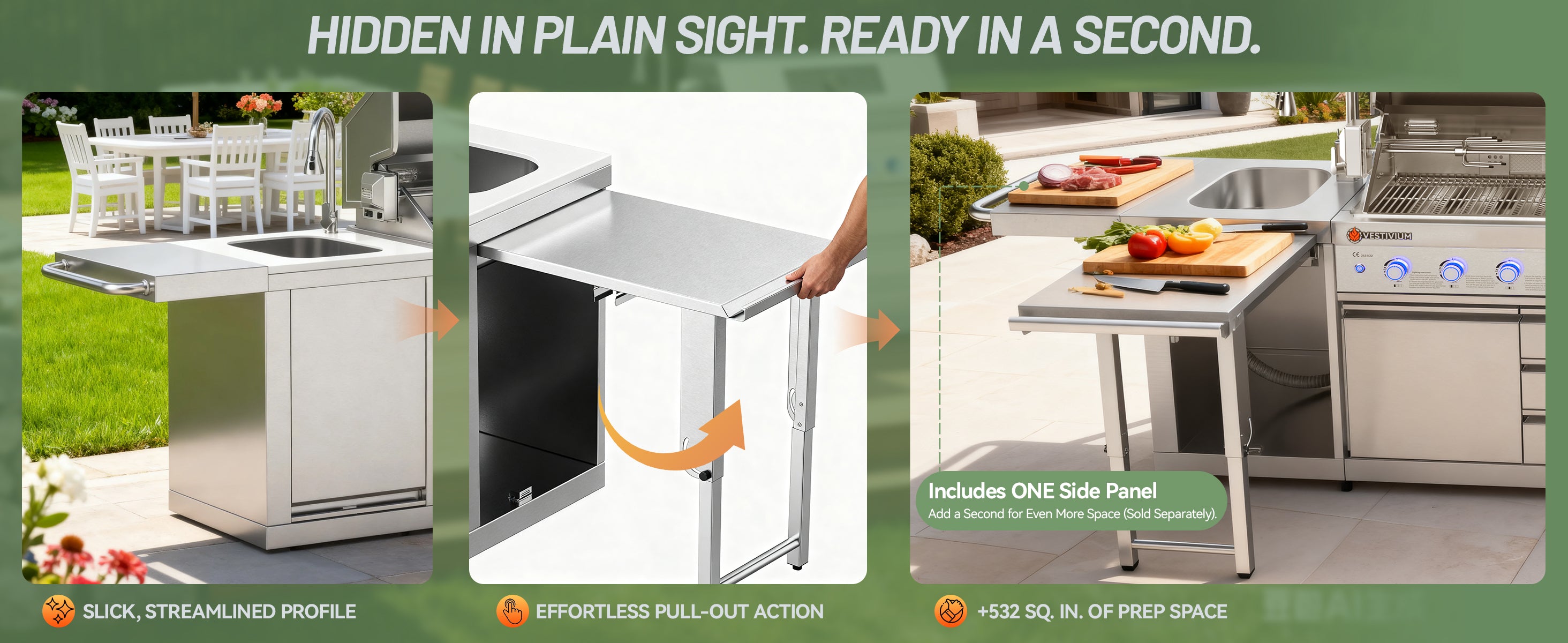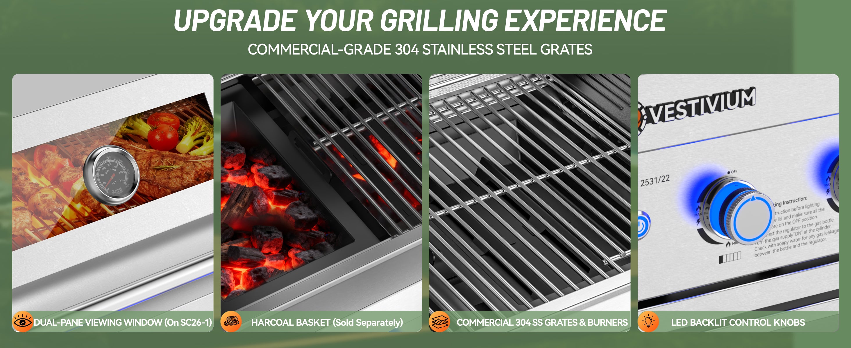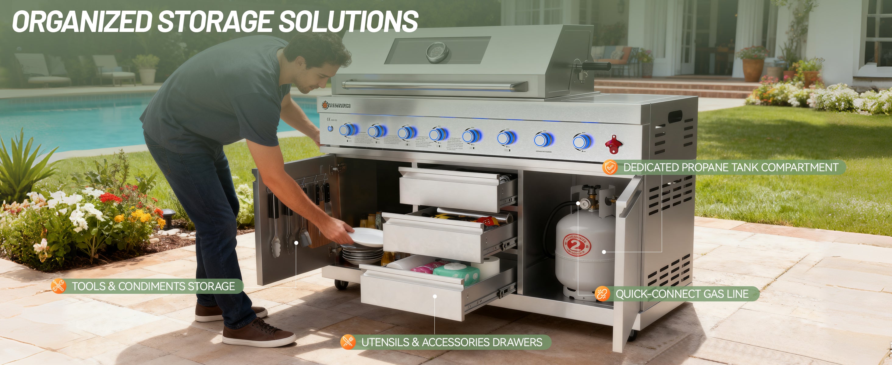 Elevate your backyard BBQ with the Vestivium Essential Outdoor Kitchen. This straight-line modular system features a powerful 6-burner gas grill for extensive cooking, an infrared rear burner for perfect rotisserie, and a convenient side burner for sauces and sides. Complete with an integrated sink cabinet for easy prep and cleanup, and a 68L single-door refrigerator to keep essentials chilled. Durable stainless steel construction ensures lasting outdoor enjoyment. The ideal compact solution for grilling and entertaining.