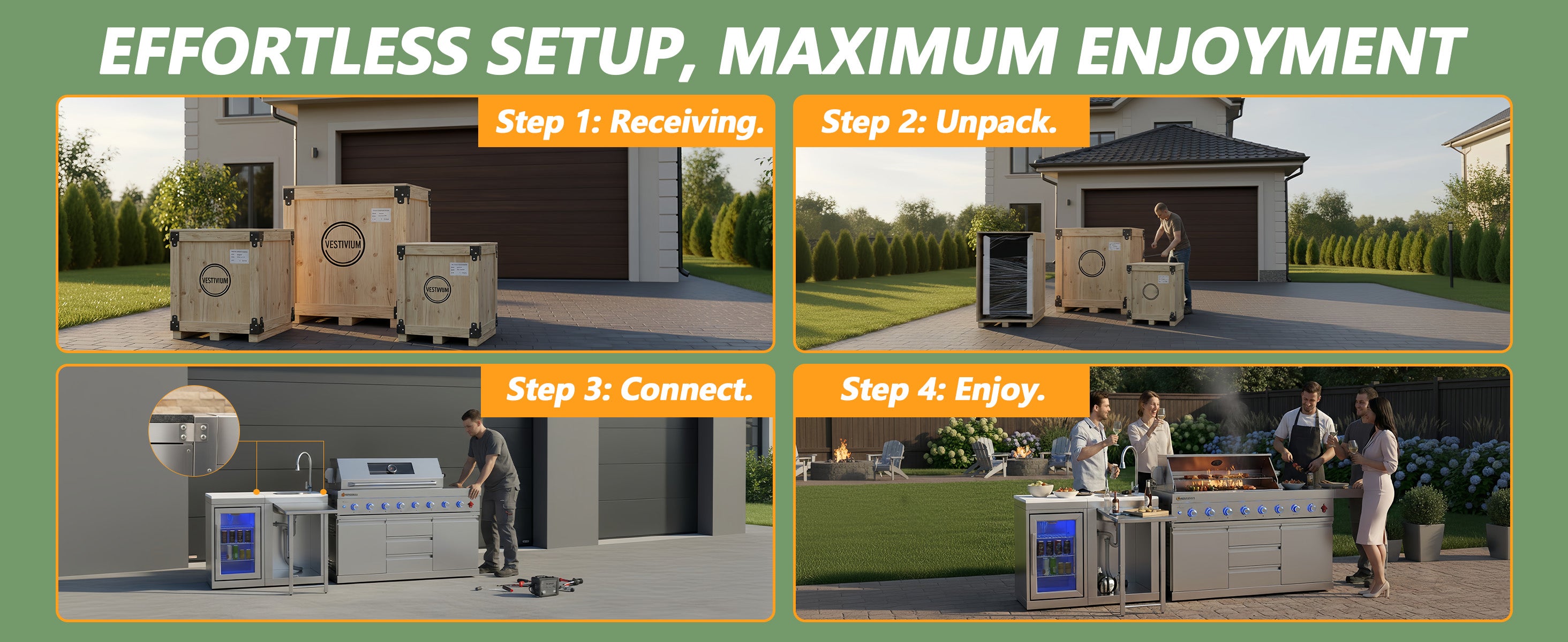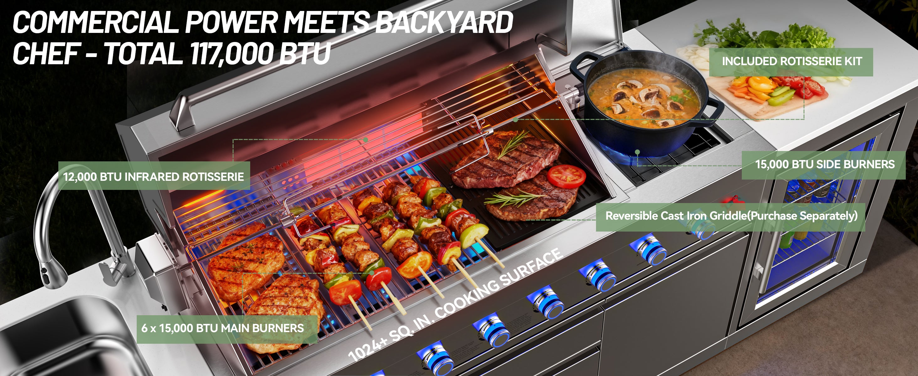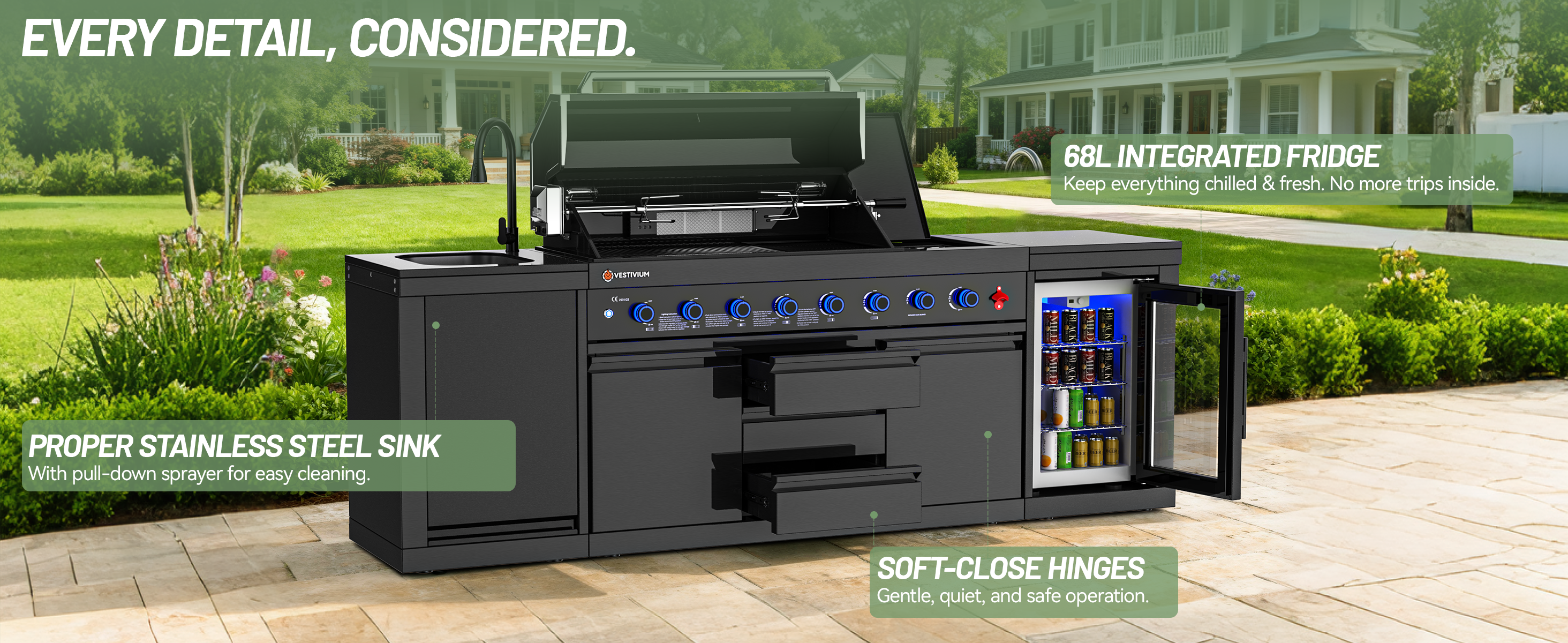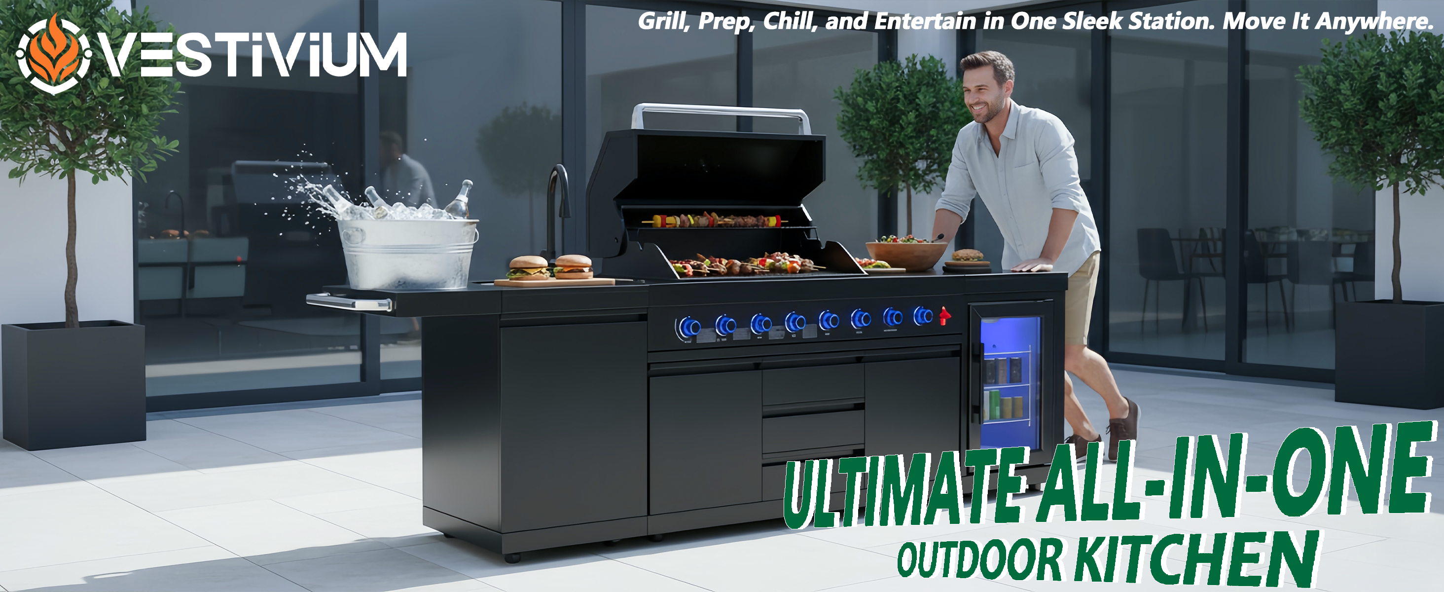 Elevate your backyard BBQ with the Vestivium Essential Outdoor Kitchen. This straight-line modular system features a powerful 6-burner gas grill for extensive cooking, an infrared rear burner for perfect rotisserie, and a convenient side burner for sauces and sides. Complete with an integrated sink cabinet for easy prep and cleanup, and a 68L single-door refrigerator to keep essentials chilled. Durable stainless steel construction ensures lasting outdoor enjoyment. The ideal compact solution for grilling and entertaining.