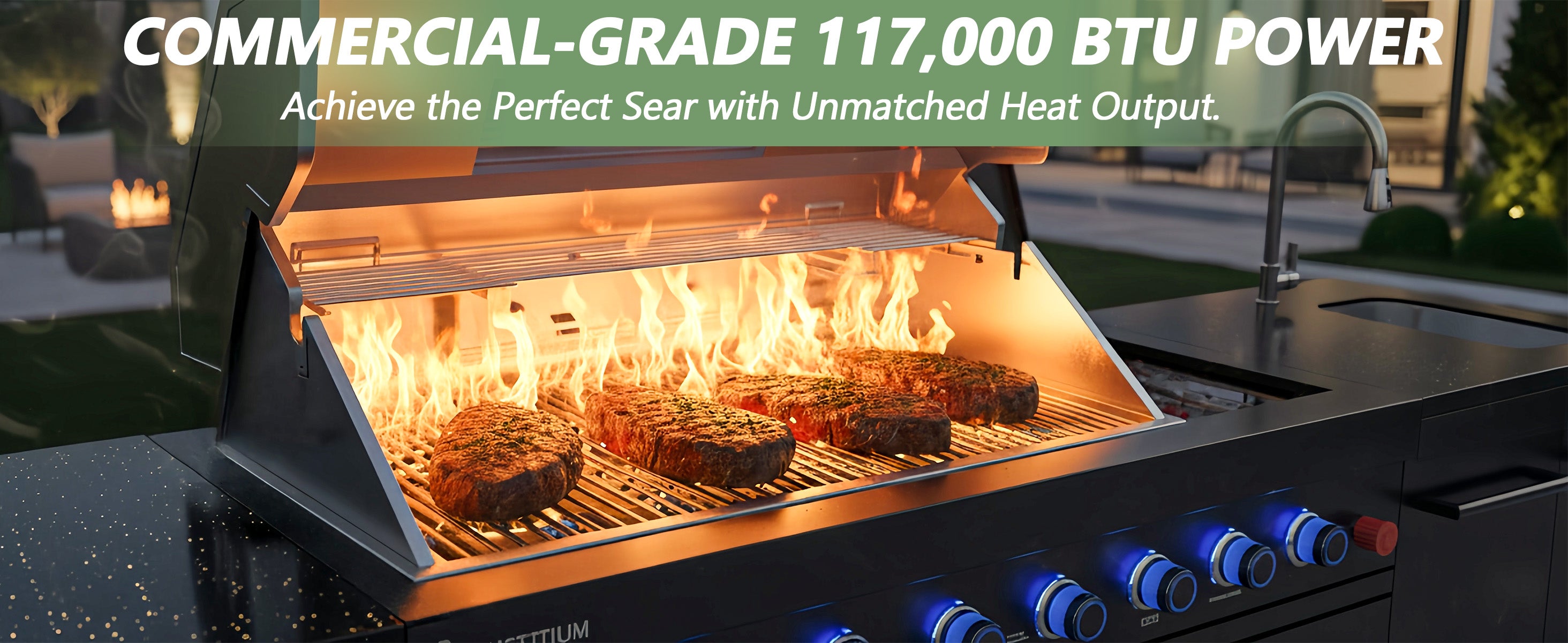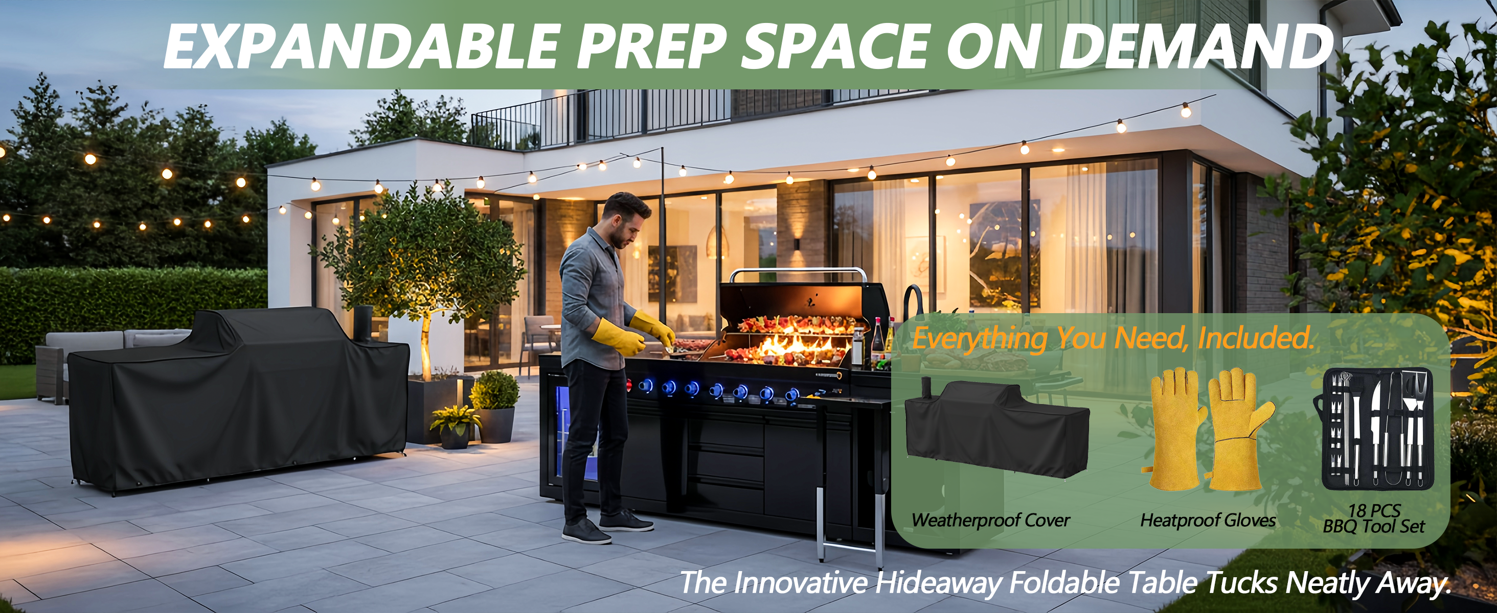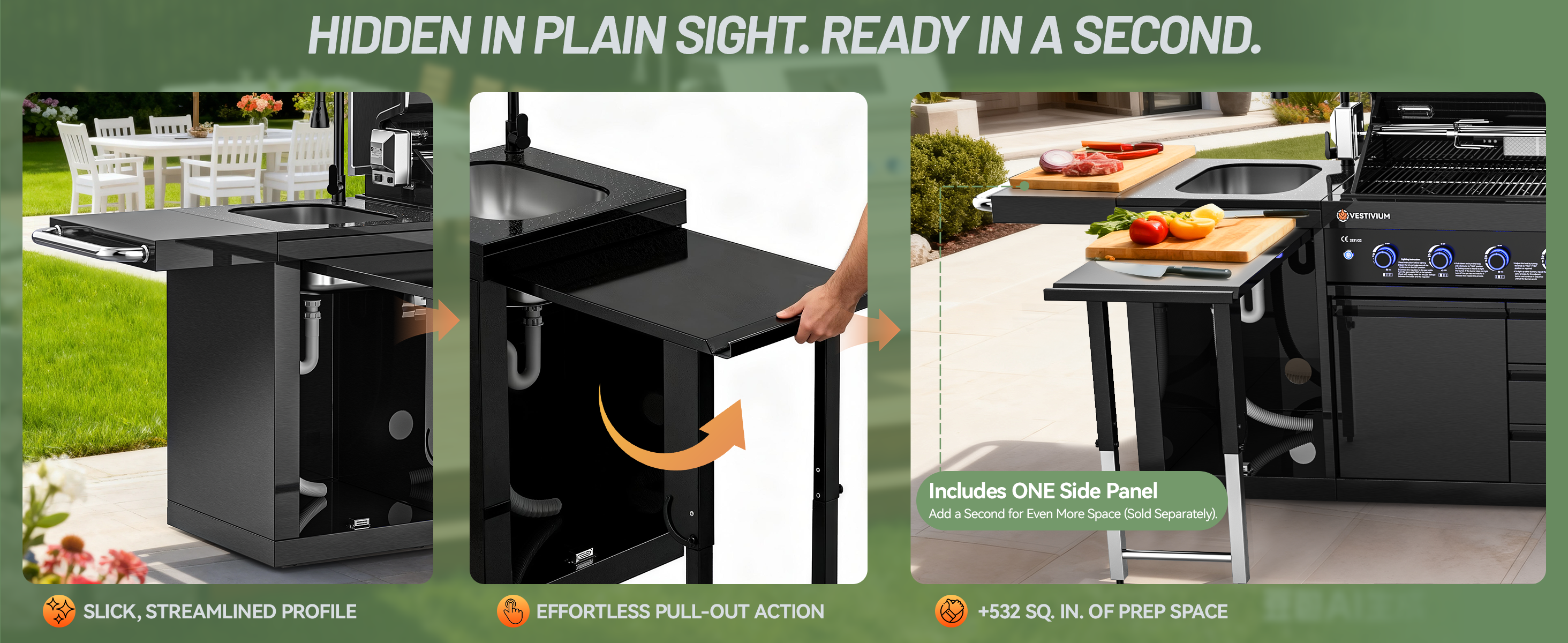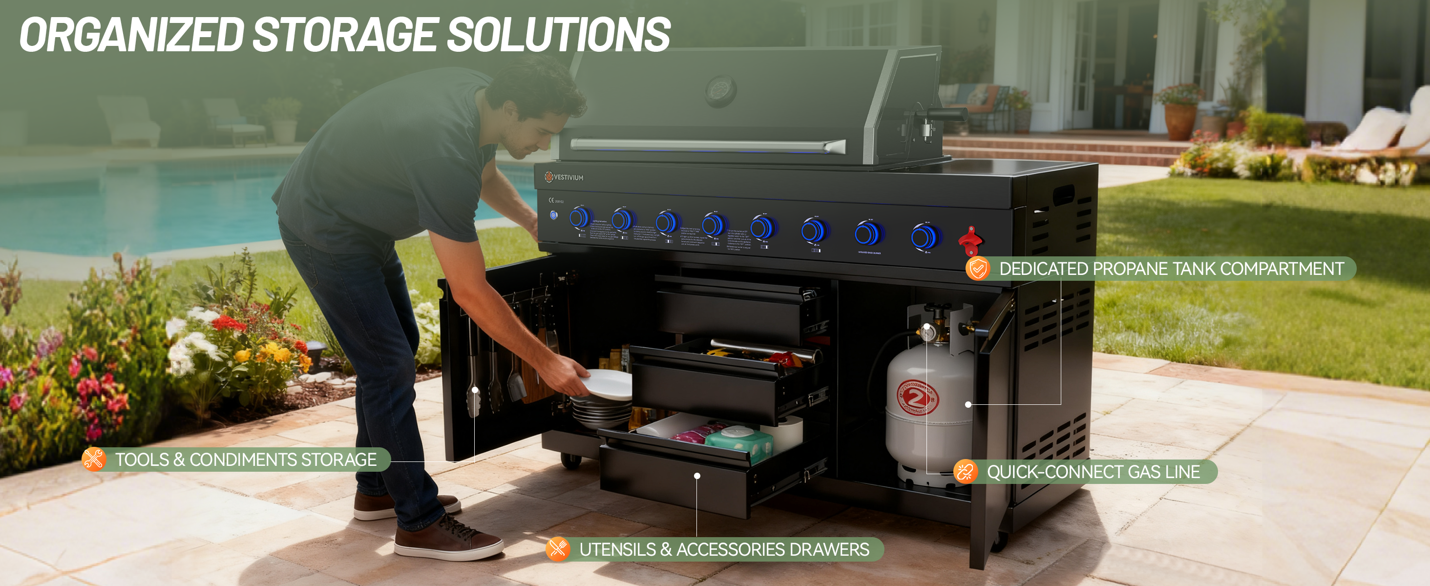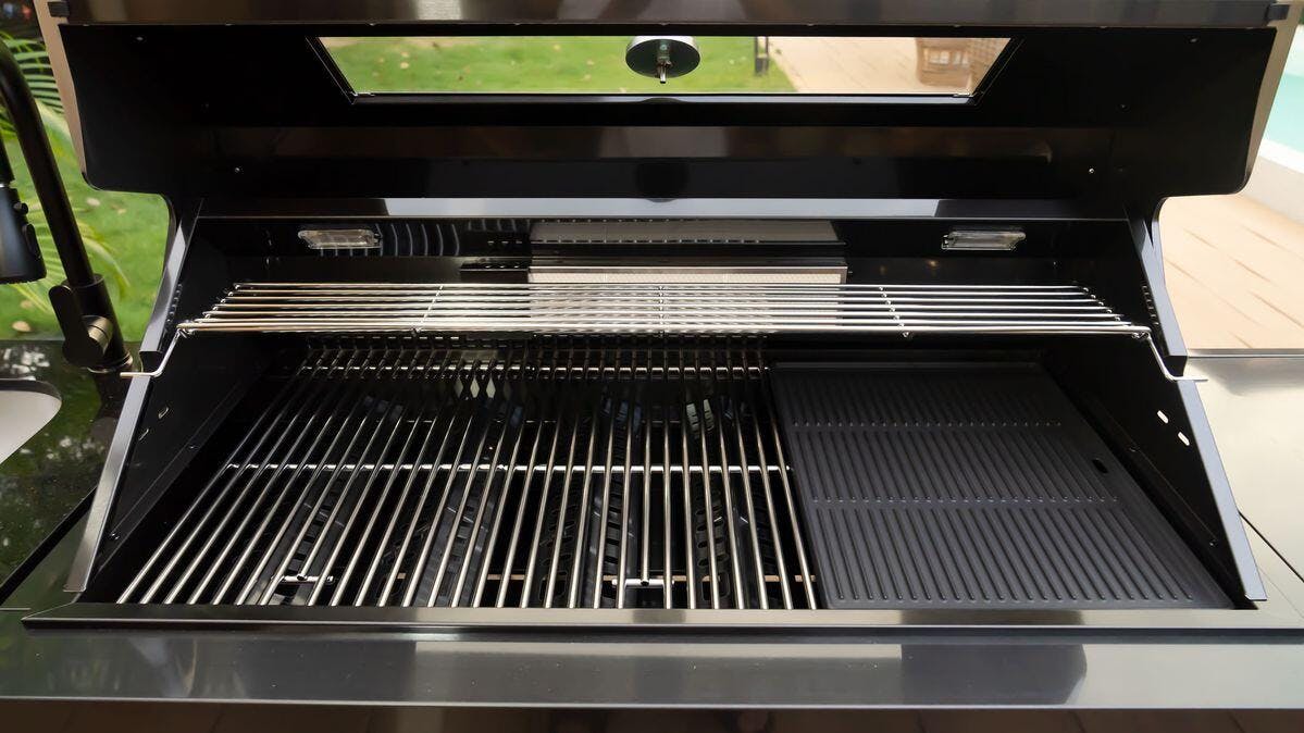 Elevate your backyard BBQ with the Vestivium Essential Outdoor Kitchen. This straight-line modular system features a powerful 6-burner gas grill for extensive cooking, an infrared rear burner for perfect rotisserie, and a convenient side burner for sauces and sides. Complete with an integrated sink cabinet for easy prep and cleanup, and a 68L single-door refrigerator to keep essentials chilled. Durable stainless steel construction ensures lasting outdoor enjoyment. The ideal compact solution for grilling and entertaining.