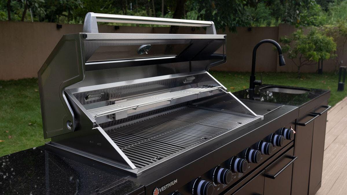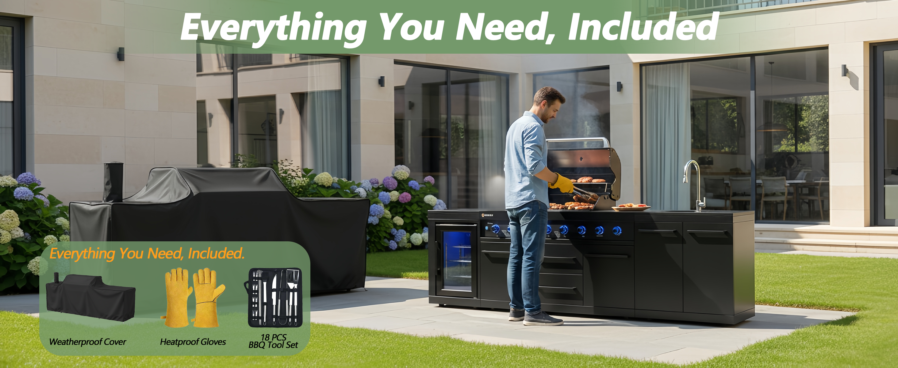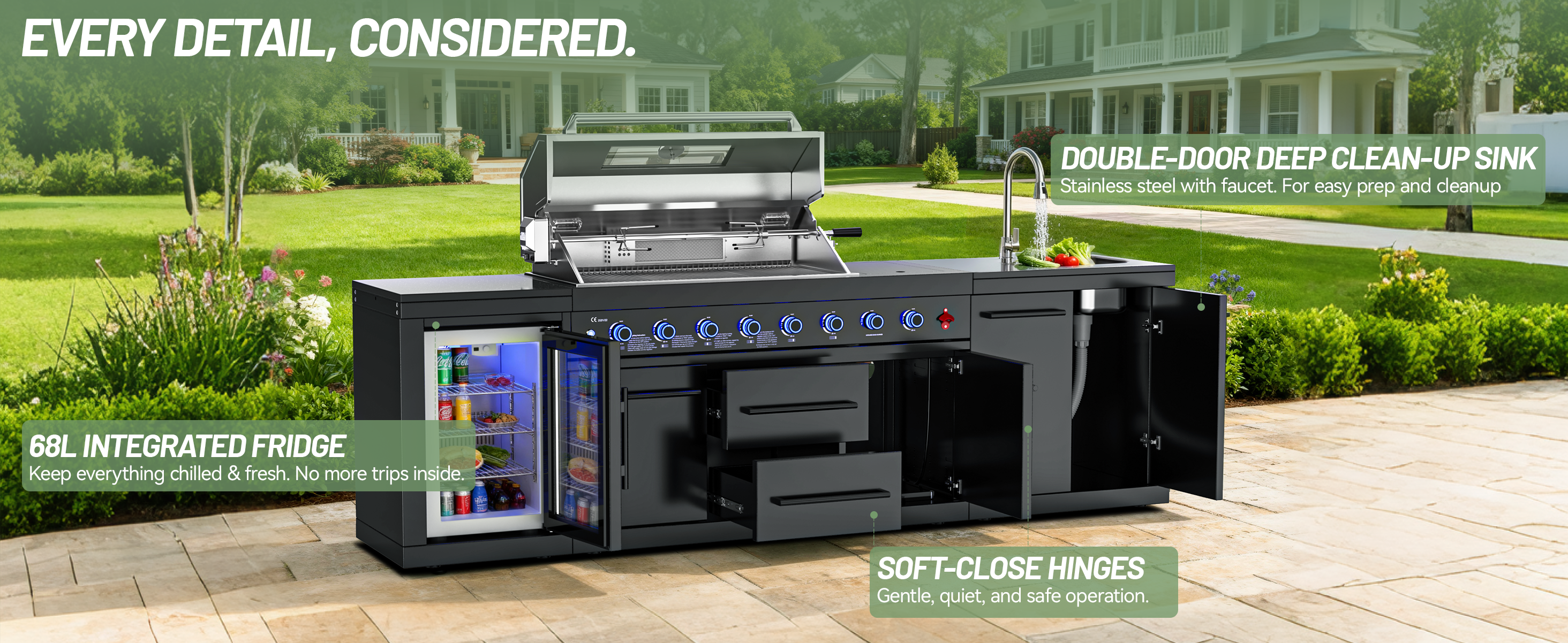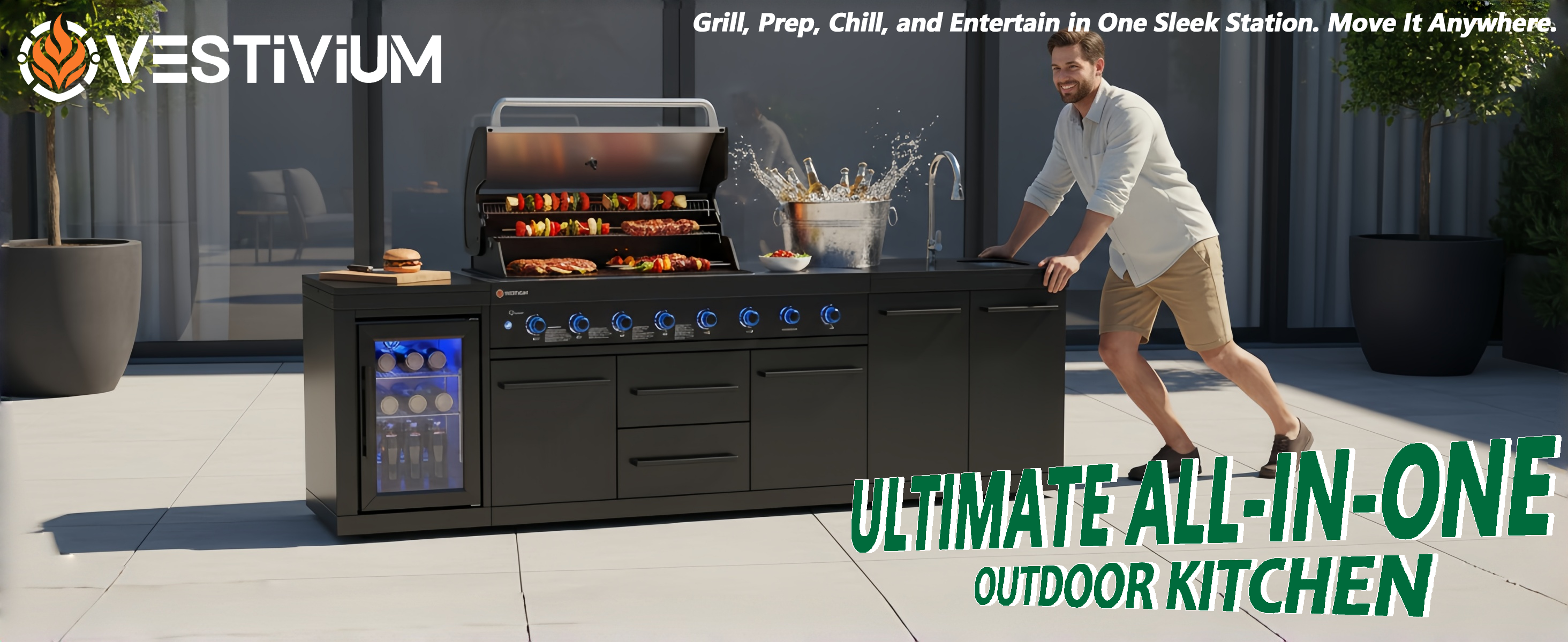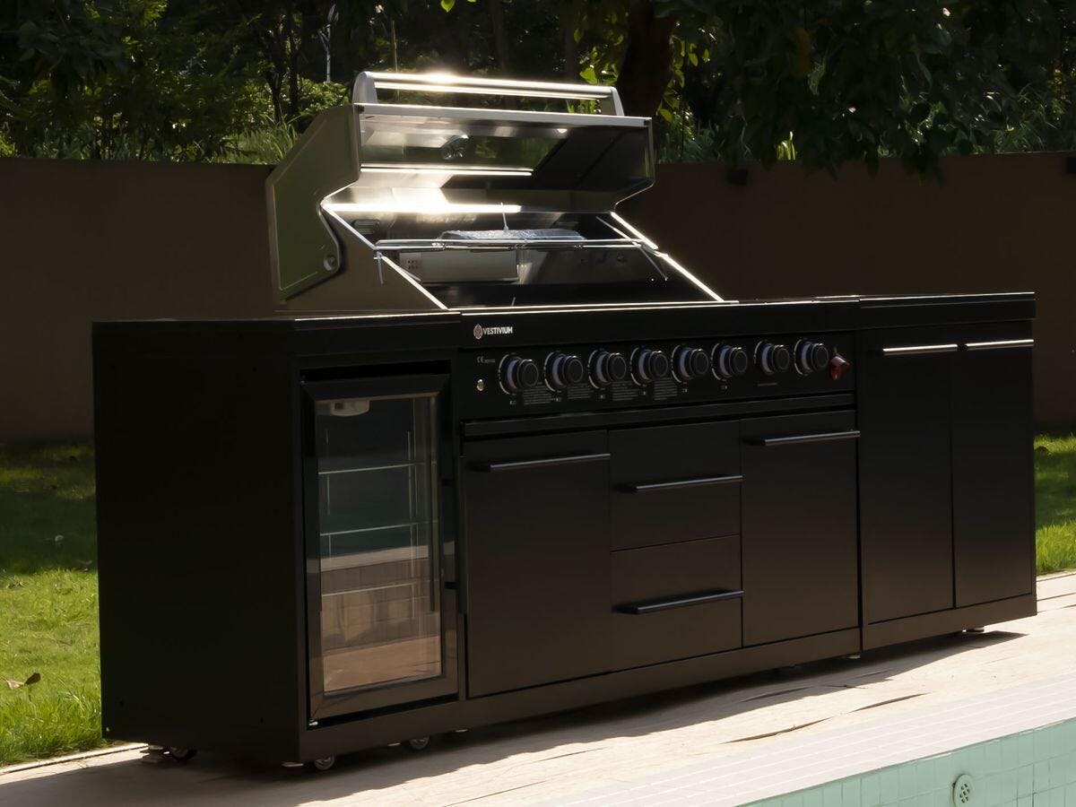 Elevate your backyard BBQ with the Vestivium Essential Outdoor Kitchen. This straight-line modular system features a powerful 6-burner gas grill for extensive cooking, an infrared rear burner for perfect rotisserie, and a convenient side burner for sauces and sides. Complete with an integrated sink cabinet for easy prep and cleanup, and a 68L single-door refrigerator to keep essentials chilled. Durable stainless steel construction ensures lasting outdoor enjoyment. The ideal compact solution for grilling and entertaining.