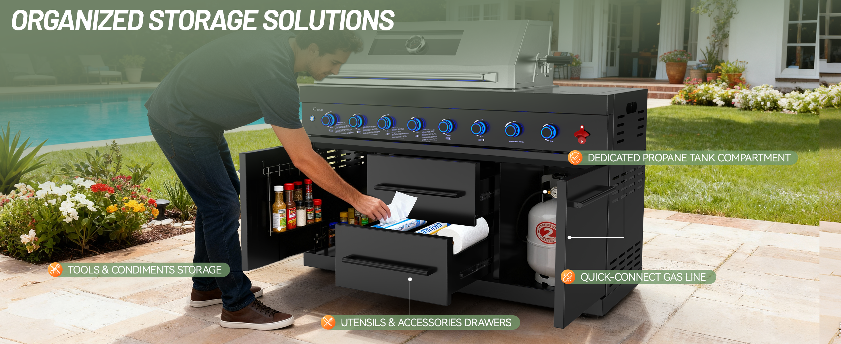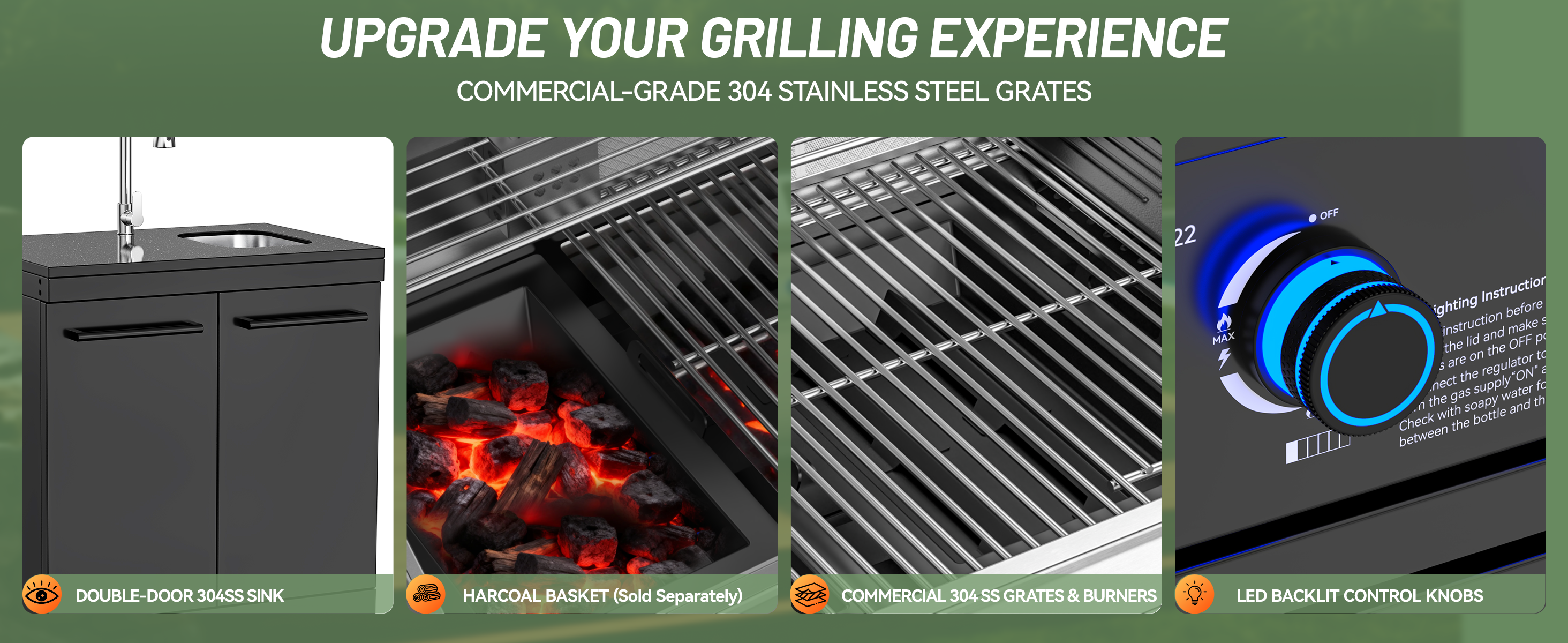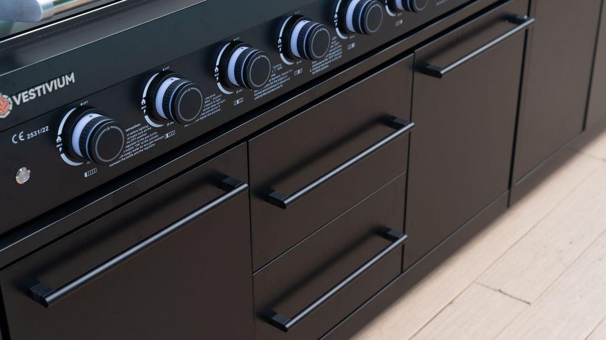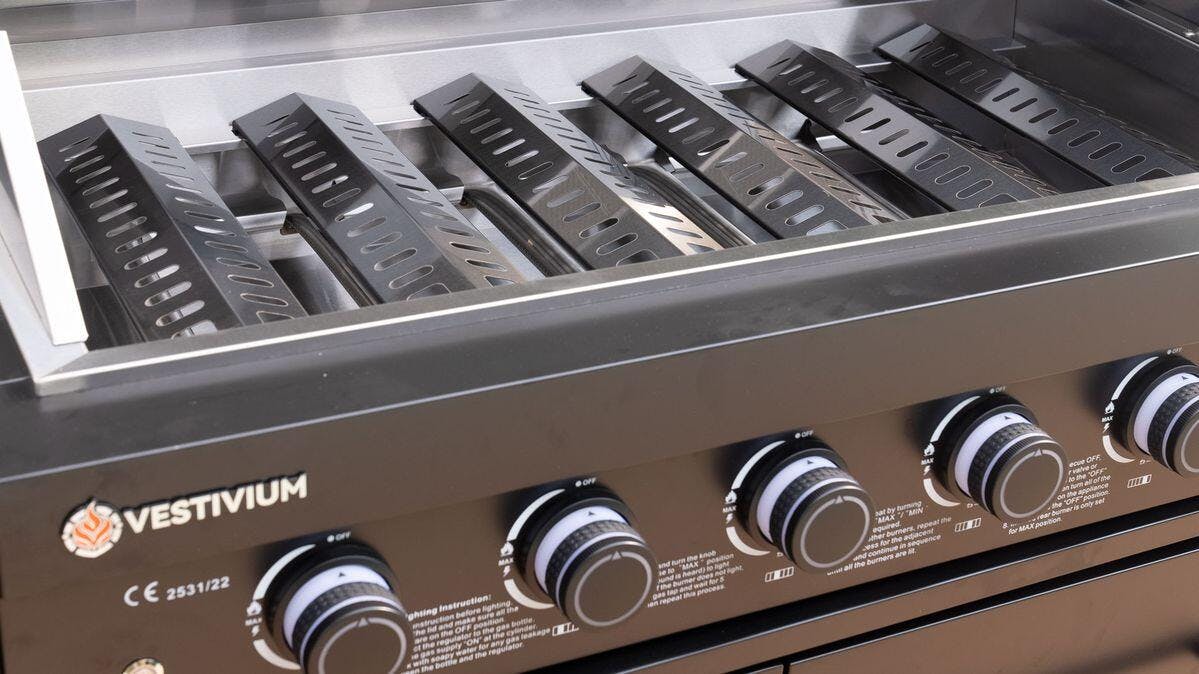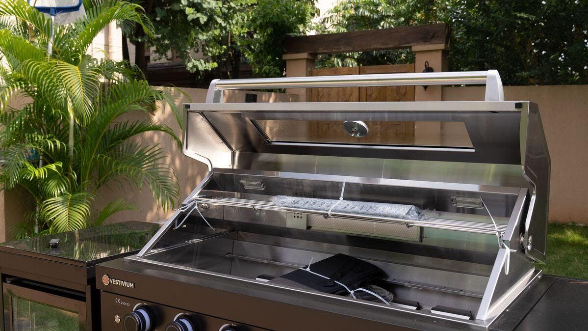 Elevate your backyard BBQ with the Vestivium Essential Outdoor Kitchen. This straight-line modular system features a powerful 6-burner gas grill for extensive cooking, an infrared rear burner for perfect rotisserie, and a convenient side burner for sauces and sides. Complete with an integrated sink cabinet for easy prep and cleanup, and a 68L single-door refrigerator to keep essentials chilled. Durable stainless steel construction ensures lasting outdoor enjoyment. The ideal compact solution for grilling and entertaining.